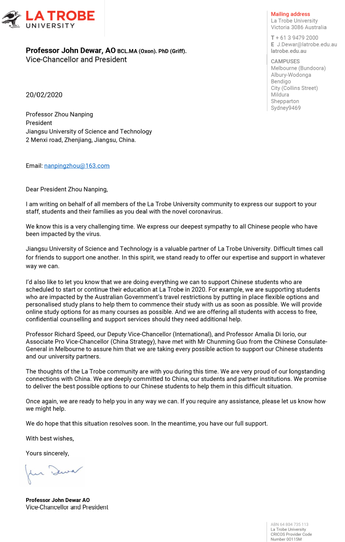 跨越大洋的情谊:“我们全力支持你们” 澳大利亚乐卓博大学校长就新冠肺炎疫情向我校发来慰问