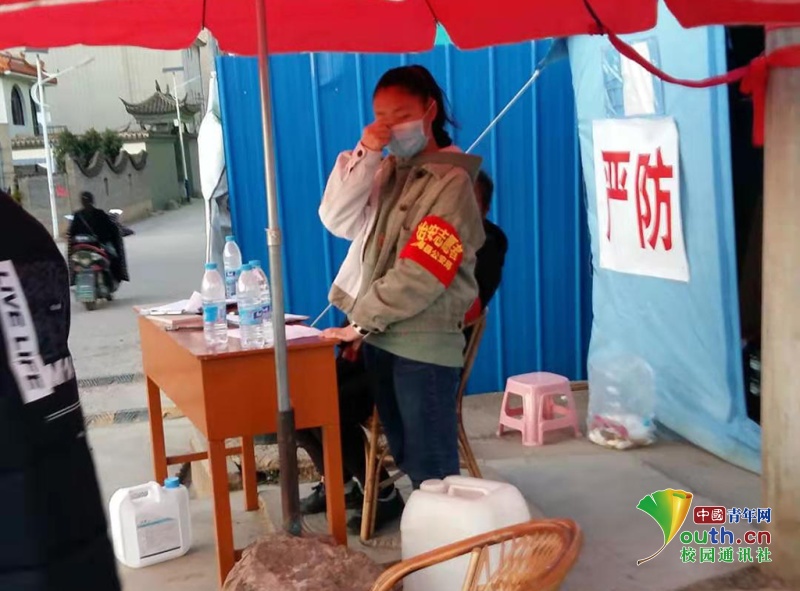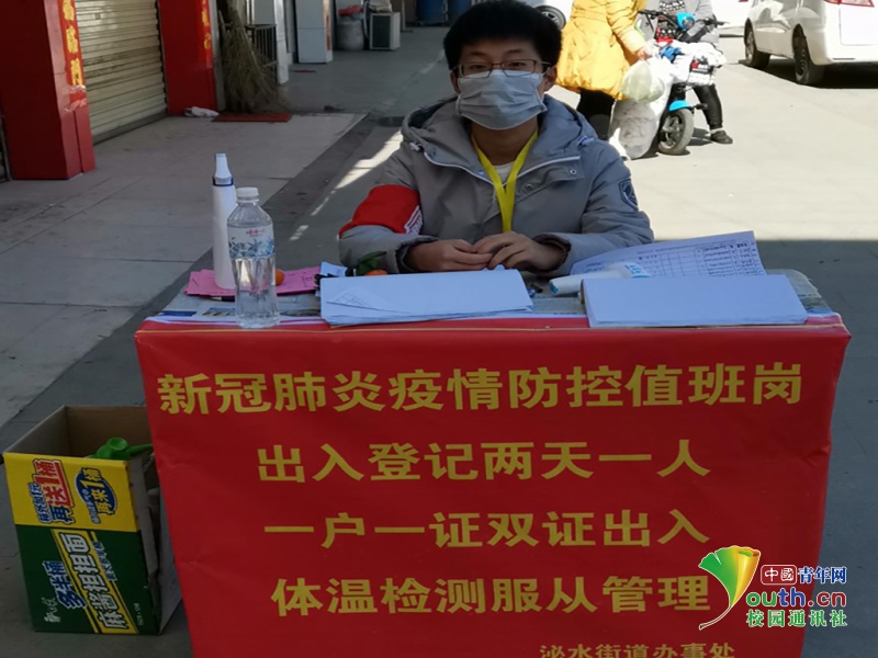 图为2017级应用化学专业杨恒明正在防疫值班。中国青年网通讯员 肖漩 供图