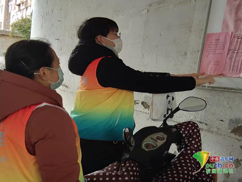 图为2018级给排水科学与工程专业朱云翔正在张贴告示。中国青年网通讯员 肖漩 供图