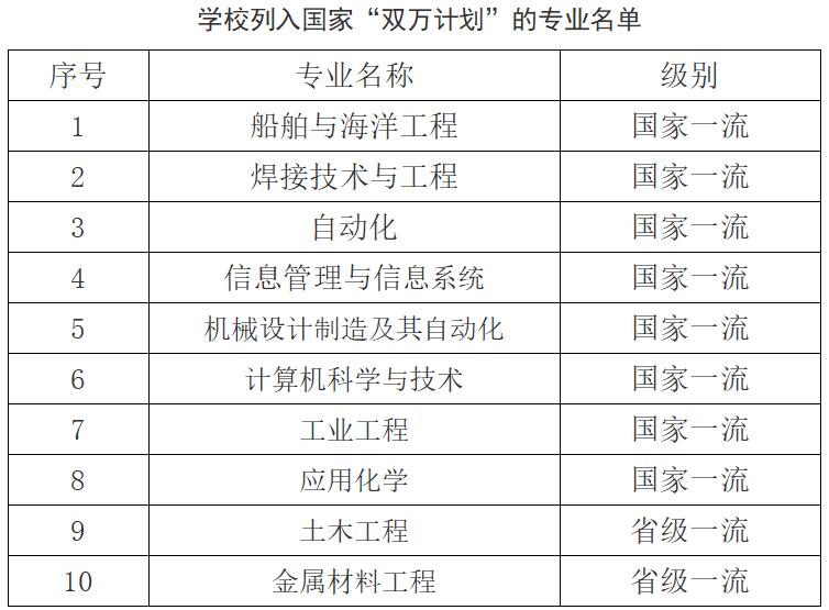 “双万计划”,即“双一流专业”计划,是教育部以建设面向未来、适应需求、引领发展、理念先进、保障有力的一流专业为目标,实施的一万个国家级、一万个省级一流本科专业建设工程项目,代表了我国专业建设的最高水平。遵循国际专业认证范式和要求,通过近年的强化建设,学校整体专业实力得到进一步提高。在教育部2019年首批公布的“双万计划”名单中,学校船舶与海洋工程等8个专业获批国家级一流本科专业建设点,土木工程、金属材料工程2个专业获批省级一流本科专业建设点。