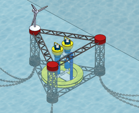 一种半潜双蘑菇式风浪能混合发电平台,本装置有效地利用海上的波浪能和风能发电,高效地利用到海上的波浪能与风能资源,解决海上波浪能发电与风力发电不稳定的缺点,将波浪能发电装置与支撑载体的相对运动最大化,保证发电效率。