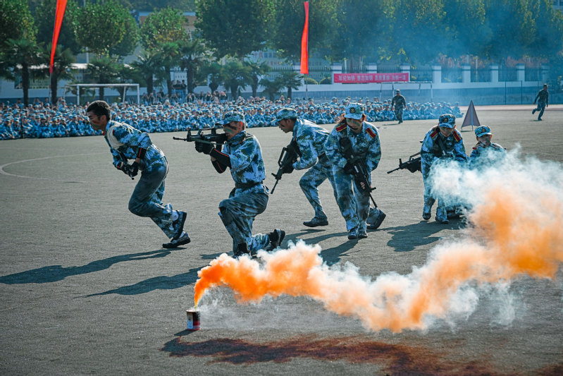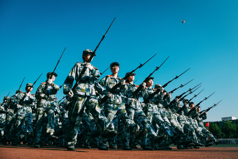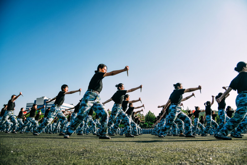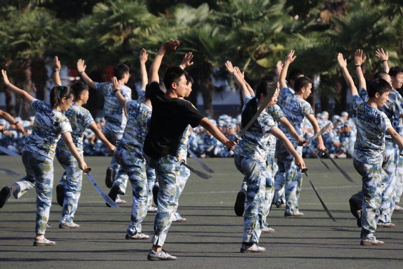 国旗方队、军旗方队雄纠纠、气昂昂,率先通过主席台。各营方阵紧随其后,坚毅的神情,高亢的口号,强劲的步伐,无不挥洒着青春的力量。巾帼不让须眉的匕首操、气势恢宏的棍术操练、所向披靡的军体格斗、大气磅礴的军体拳、凌厉矫健的模拟战术、热烈活泼的拉歌,精彩纷呈的表演博得了现场观摩师生阵阵掌声。