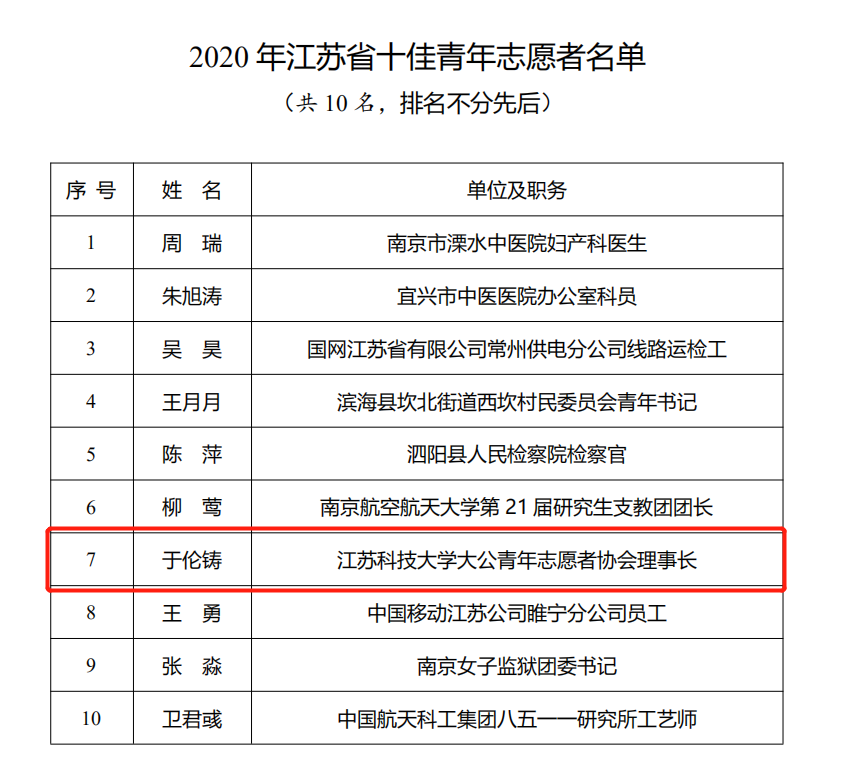 2020年江苏省十佳青年志愿者名单
