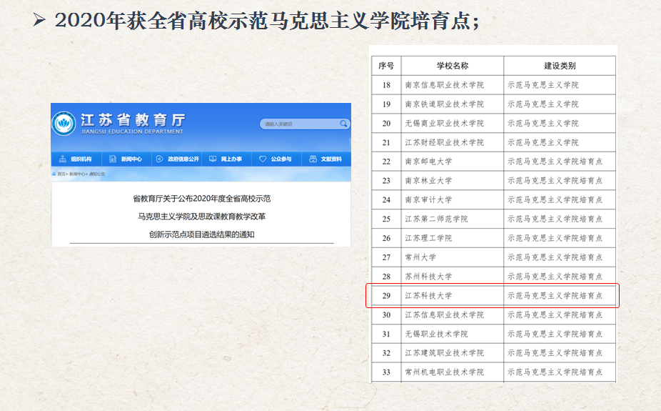 教学成果持续提升。思政课线上线下混合式教学形成特色,疫情期间制定了《思想政治理论课线上线下混合教学九条规范要求》和《线上线下混合教学“一室一品”特色方案》组织专题教学;连线参加武汉一线抗疫的医护人员为全体思政课教师讲解《抗疫中的家国情怀》,老师们将一线抗疫医护人员的朴实话语进行理论升华,通过网络课堂传播抗疫精神,学习强国江苏平台以《给大学生在线讲好战“疫”中的“家国情怀”》大篇幅报道了这一做法;注重成果提升,与镇江市文广集团合作拍摄三集紧扣现实的抗疫思政课,以《精神的丰碑》为主题拍摄的十集微课程获评江苏省微课程一等奖,目前学习强国江苏平台点击率逾10万。