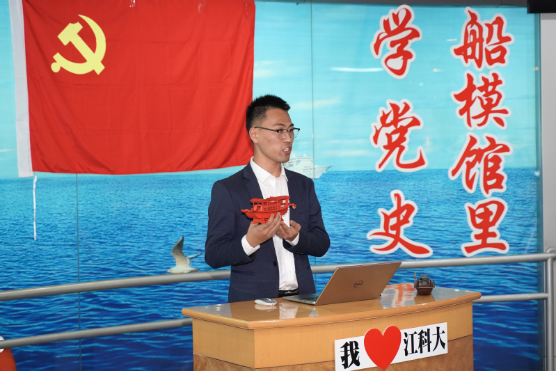 小小红船划出新中国,巍巍巨轮航向新征程。在船舶模型馆,来自船海学院景荣春党支部的大学生开展了一场别开生面的党史学习。“我手上拿的这艘小船就是当年承载着平均年龄28岁的中中共一大代表们的红船的模型,在这里我要感谢陈宇同学和徐帆同学,为了能够有一艘模型可以展示,他们自己设计、切割、拼装,用自己所学专业知识完美复刻了当年那艘伟大的小船。”景荣春党支部书记夏志平拿出同学们亲手设计制作的红船,邀请马克思主义学院的李树文老师深入阐述“红船精神”,讲述“小船托起大党”的故事。