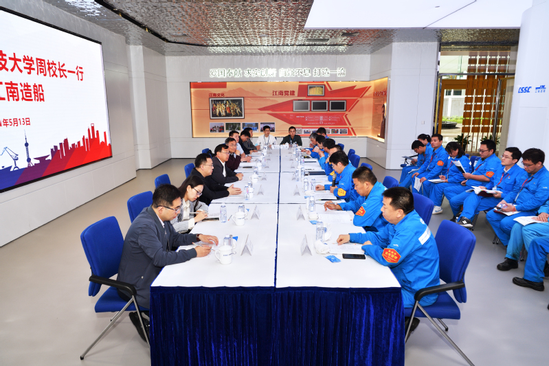 在随后举行的校企工程实训座谈会上,校领导携我校五位青年博士与江南造船相关负责人进行亲切会谈。双方在亲切友好的气氛中共叙友谊、共同展望良好的合作前景,并就如何推进现有的合作项目、进一步加强未来的合作深入交换意见,达成共识。