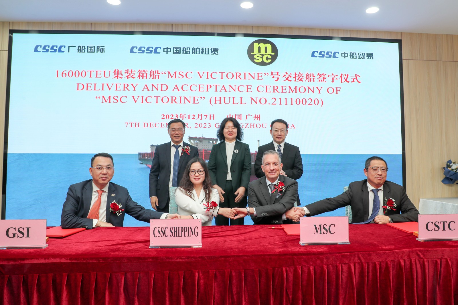 在广船国际调研交流期间,适逢由广船国际联合中国船舶工业贸易有限公司为MSC地中海航运集团和中国船舶(香港)航运租赁有限公司建造的16000TEU集装箱船3号船命名交付。嵇春艳校长作为命名嘉宾,将该船命名为“MSC VICTORINE”(MSC维多琳)号,MSC地中海航运集团新造船总监Giuseppe Gargiulo,中船租赁董事会秘书王海、总经理助理何芳,广船国际总经理陈激共同见证命名。该船最多可运载16464个标准集装箱,是目前粤港澳大湾区建造的最大吨位的集装箱船之一,配置先进的空气润滑减阻系统、抱轴式发电机以及混合式脱硫装置,并预留LNG改装功能,能效设计指数(EEDI)比基线低58%以上,是一艘兼具环保性和经济性的绿色船舶。
