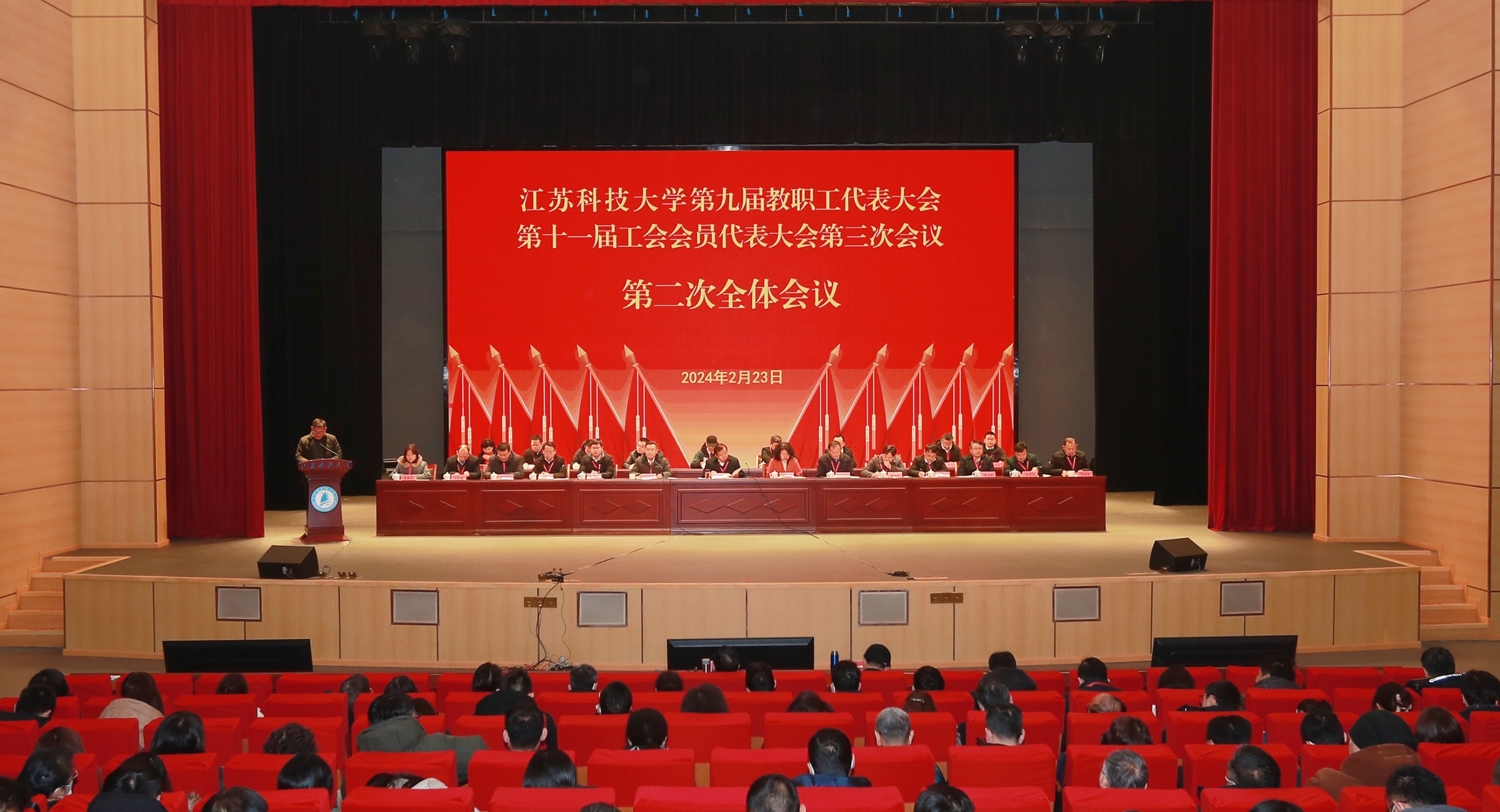 在第一次全体会议上,校长嵇春艳作题为《实干争效敢为善为奋力拼出高质量发展新局面》工作报告,对2023年的工作成绩和亮点进行了回顾,并对2024年的工作做出了详细部署。她强调,2024年是一个意义重大的年份,全校师生应以龙腾虎跃的志气,起好奋进之步,以龙骧虎视的魄力,起好攻坚之步,以龙精虎猛的干劲,起好落实之步。校党委书记周南平作题为《勇担新使命奋力新作为谱写高水平大学建设崭新篇章》的讲话,他强调,要全面把握新时代、新机遇、新要求,坚持党建引领,凝心聚力谱写高水平大学建设崭新篇章。本阶段参会人员扩大至全校教职工,所有教职工通过现场及在线视频会议的方式共同参加。
