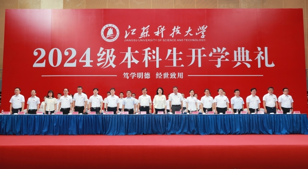 在庄严的国歌声中,开学典礼拉开序幕。校党委常委、副校长胡爱祥主持开学典礼。校友代表、中国船舶集团高级专家严忠胜研究员,校领导周南平、嵇春艳、汤建、潘锦全、任南、安祥卫、施伟东、周宏根、叶永林,校党委常委李恒川、周春燕,相关职能部门、各学院负责人,教师代表、校友代表以及镇江校区2024级本科生,在长山校区共享体育馆参加开学典礼。