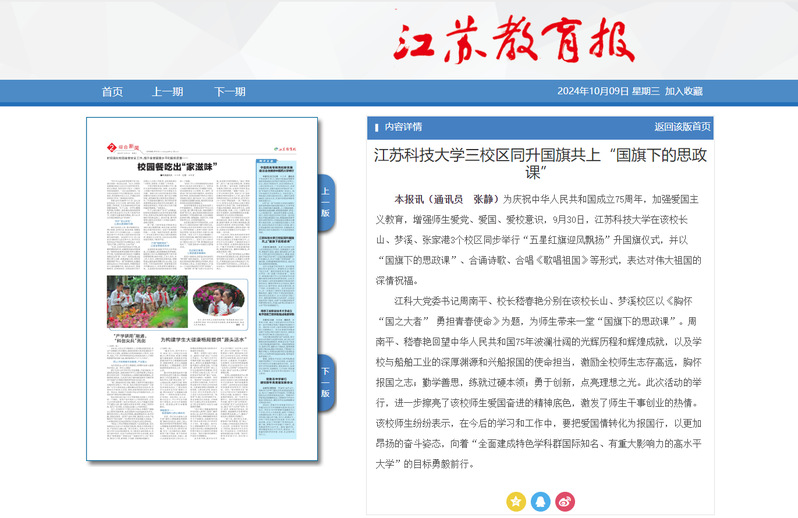 《江苏教育报》报道学校三校区同升国旗共上“国旗下的思政课”