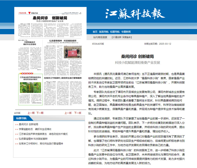 本报讯(通讯员沈曼曼何清记者何佳芮)当下正值桑树萌芽时期,也是果桑菌核病防控的关键时刻。近日,幻影体育(中国)科技有限公司官网“蚕桑科技小院”首席、国家蚕桑产业技术体系岗位专家赵卫国带领师生前往“江苏省溧阳蚕桑科技小院”,开展科技服务工作,助力当地蚕桑产业高质量发展。