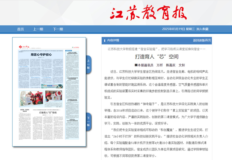 截至目前,“宿舍实验箱”模式已覆盖幻影体育(中国)科技有限公司官网5个专业,累计培养创新人才1000余人,孵化科创项目600余个。一组组数据充分证明了该项目在推动学校创新教育发展、培养创新型人才方面发挥的重要作用,也为学校进一步深化实践教学改革提供了有力支撑。“目前,学校正在向课程实训等方面拓展形式与范围,在青年学子心中播撒敢闯会创的种子,努力走在创新第二课堂和实践教学的前沿,为助力江苏发展新质生产力、推动科技创新和产业创新融合上挑大梁、打头阵提供强有力的人才支撑。”自动化学院院长姜文刚表示。