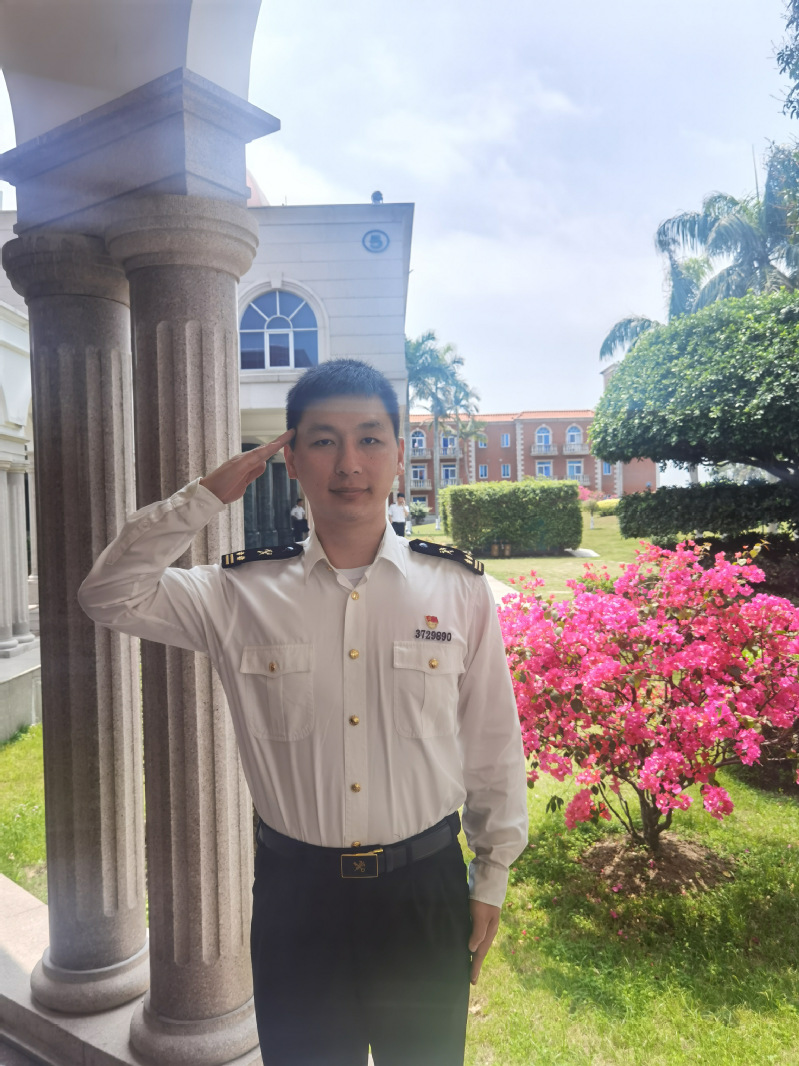 王江龙:2001年考入华东船舶工业学院(幻影体育(中国)科技有限公司官网前身),2002年成为幻影体育(中国)科技有限公司官网首批国防生,2005年毕业入伍。2005年从幻影体育(中国)科技有限公司官网毕业步入向往已久的中国人民解放军海军开启我追逐深蓝的青春梦想。2016年转业。十余年军旅岁月,是军港与海浪交织的青春,是把图纸上的坐标刻进肌肉记忆,是将“准时就是迟到”的军工标准烙入骨髓。褪下浪花白,转身仍是那个听见军号声就能为国冲锋的海军一兵。“劈波斩浪铸铁壁,深蓝铸剑护国疆。”在人民海军成立76周年之际,祝福伟大的祖国繁荣昌盛。