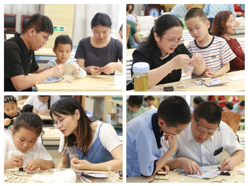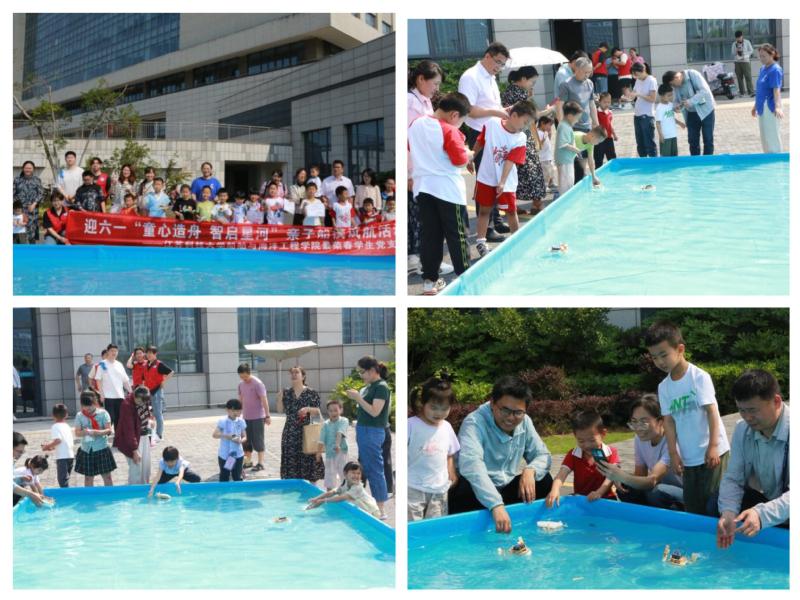 作为活动重头戏,“童心造舟 智启星河”亲子船模试航活动将学校船舶特色文化融入节日传承。图书馆104报告厅化身为船舶知识小课堂,来自船舶海洋与工程学院的大学生志愿者们通过视频演示、趣味讲解,向教职工子女们介绍船舶构造、航海原理等知识。随后的亲子船模制作环节中,家长与孩子协作拼装船身、绘制创意图案,现场洋溢着温情与创意。在户外水池举办的船模竞速赛上,一艘艘承载着孩子们奇思妙想的小船“破浪前行”,欢呼声此起彼伏,参与者自豪之情溢于言表。这场跨学段联动的“船舶思政课”,让船舶特色教育从课堂延伸到家庭,让爱国情怀与专业理想在代际传递中层层升华。