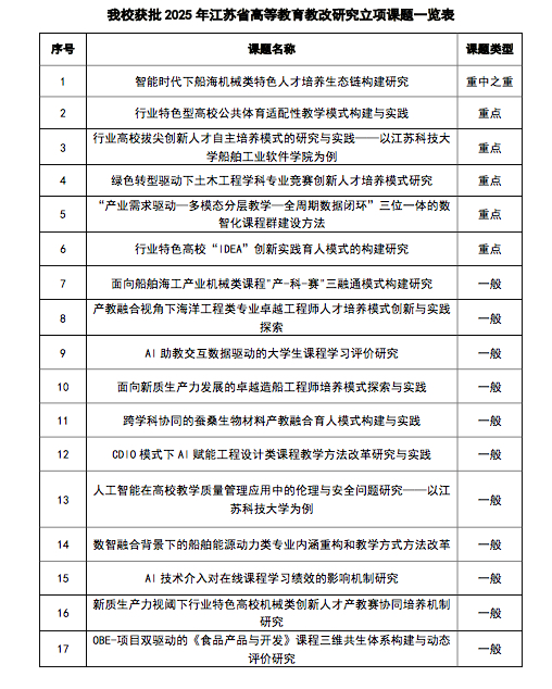 近日,江苏省高等教育学会发布了《关于公布2025年江苏省高等教育教改研究立项课题评选结果的通知》(苏高教会〔2025〕30号),我校成功获批19项课题,其中重中之重课题1项、重点课题5项、一般课题13项,继2023年,我校连续获批重中之重课题,课题获批数量再创历史新高,位居江苏高校前列。